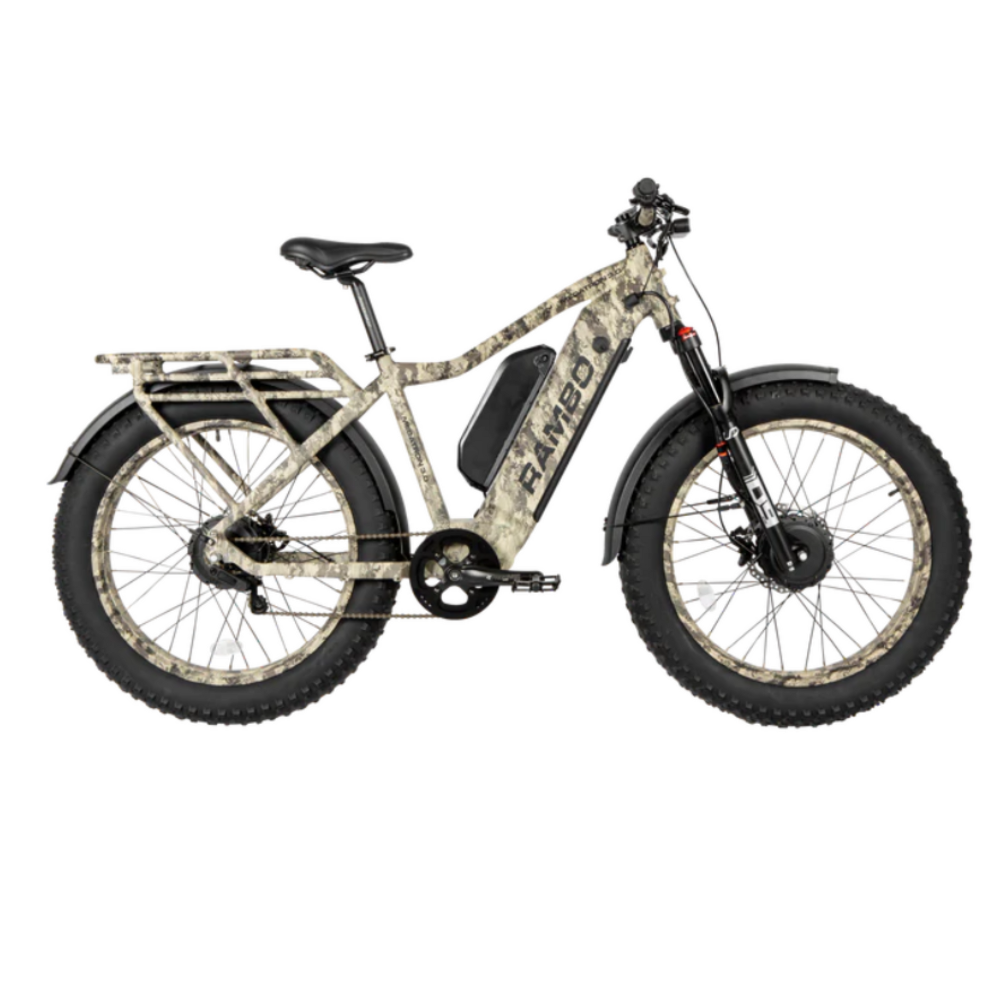 Rambo Megatron is equipped with two dual 1000w motors with a combined peak rating of 3000 watts of power giving an outstanding performance. On a hub-drive electric bike, the motor will be integrated into either the front or rear wheel of the bike, or like in the Rambo Megatron case both hubs. The hub-drive motor operates independently of the gears and applies torque directly to the wheel. Because the motor is integrated into the wheel hub, hub-drive electric hunting bikes typically cannot be used in conjunction with most internal gear hubs.